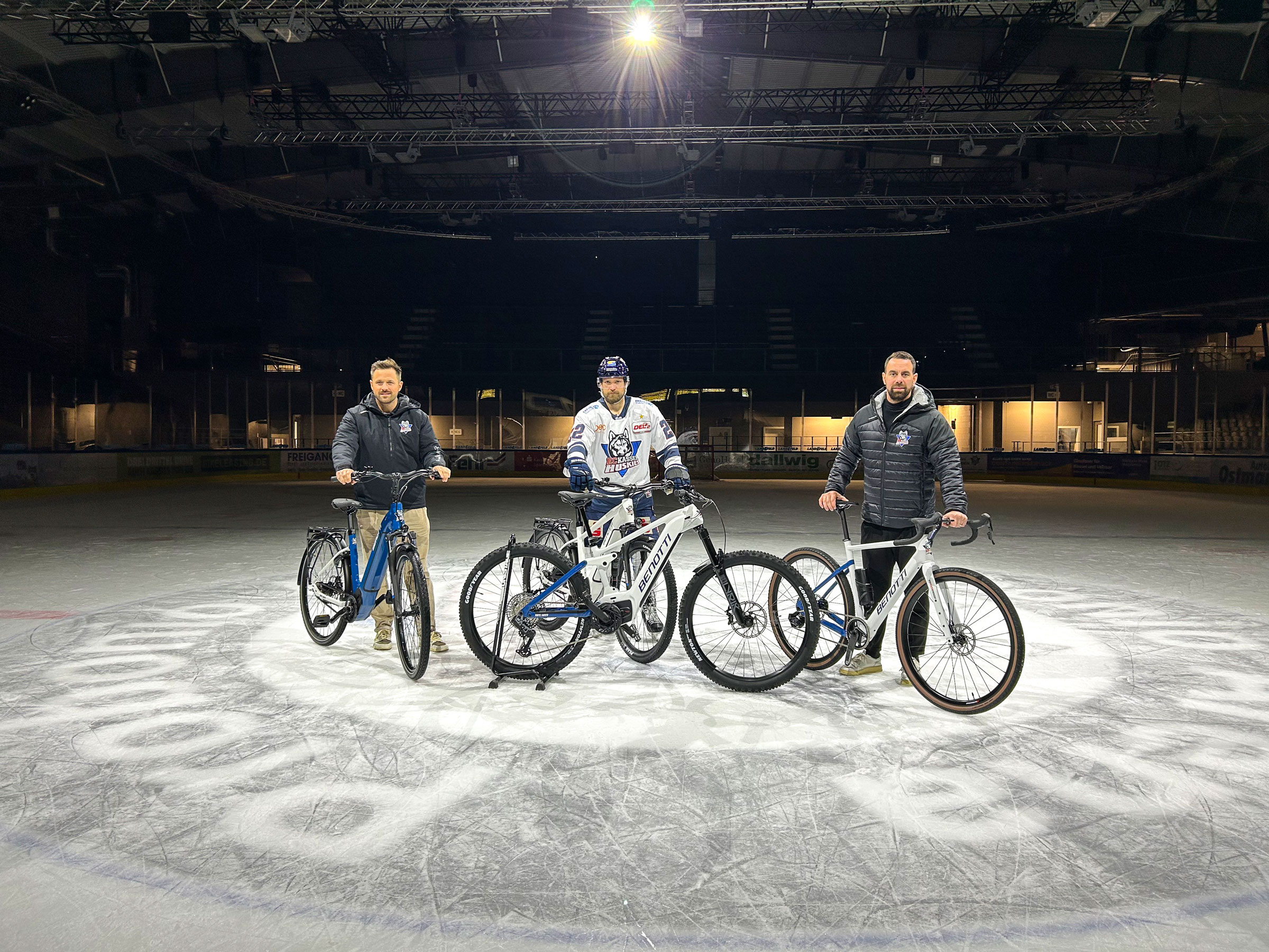 - Verschiedene E-Bikes mit Kassel Huskies-Logo und den Vereinsfarben